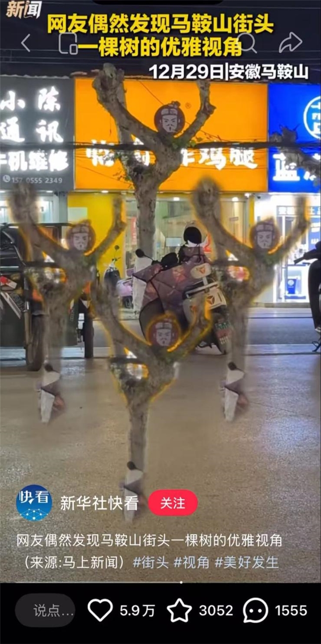 据了解,此次热搜不是临榆炸鸡腿首次引发讨论热潮。前不久,新华社便报道过其马鞍山和县门店的“优雅视角”。该门店门前的行道树经冬季修剪后,枝丫形态恰巧与招牌上的秦俑IP形象错位融合,伸展的枝干宛如芭蕾舞者的手臂与腿部,呈现出标准的瑜伽“树式”姿态。这一自然形成的街头景观,吸引了大量路人驻足拍照、模仿打卡,并在社交媒体上进行二次创作,这一事件也成功将临榆炸鸡腿融入了年轻人的日常社交语境。