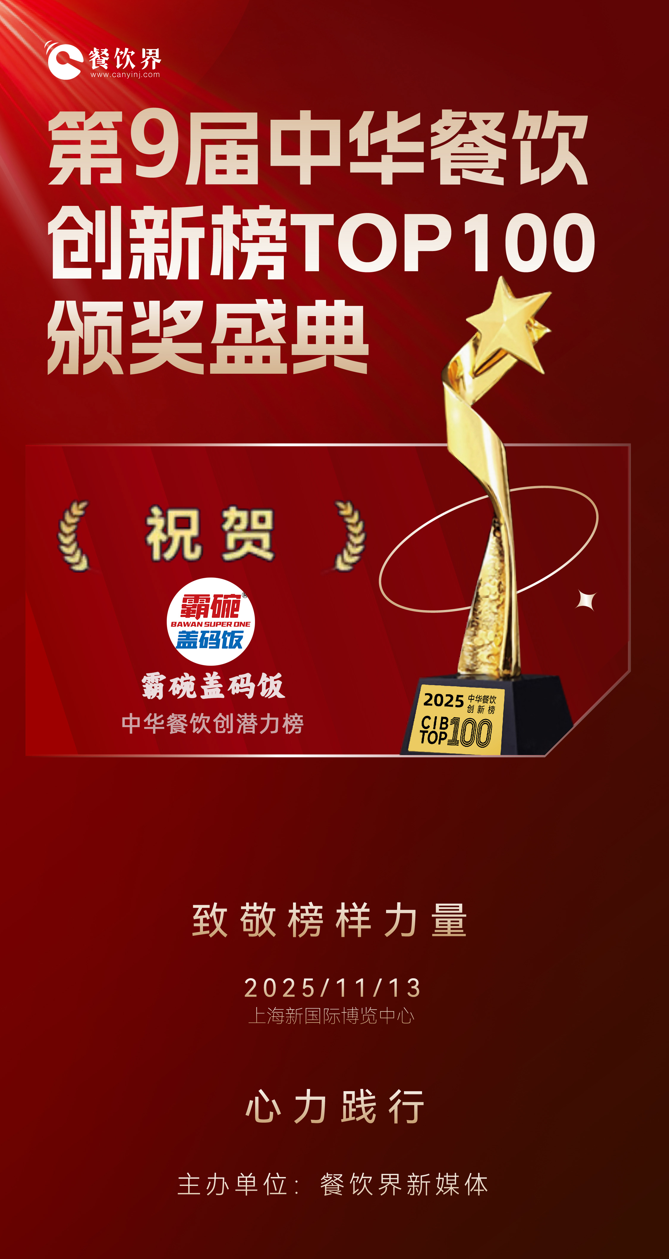 作为国内首个以“餐饮创新”为核心的标杆性评选,中华餐饮创新榜(CIBTOP100)由《餐饮界》新媒体联合全国150+媒体发起,至今已成功举办九届。榜单通过300万+网友网络投票评选,依托千万级曝光量成为餐饮创新趋势的重要风向标。本届评选中,霸碗凭借在“科技赋能餐饮标准化”与“湘菜年轻化表达”上的突出成果,从众多参选品牌中脱颖而出,彰显其在快餐赛道的创新潜力与行业影响力。