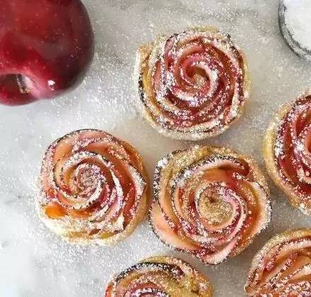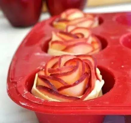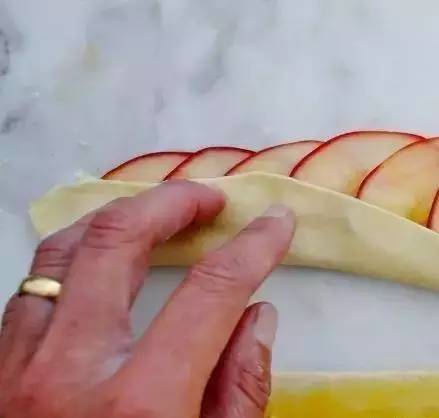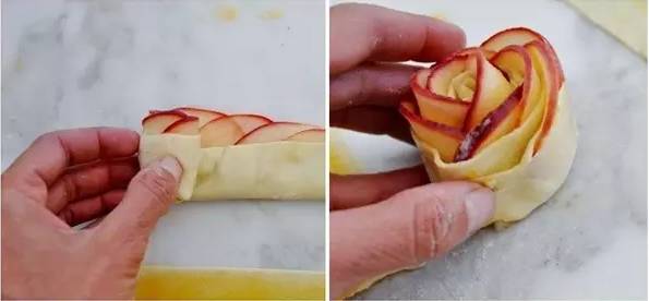 7.将裹好苹果的面皮如图卷起来,卷完“玫瑰”的形状也就出来啦!