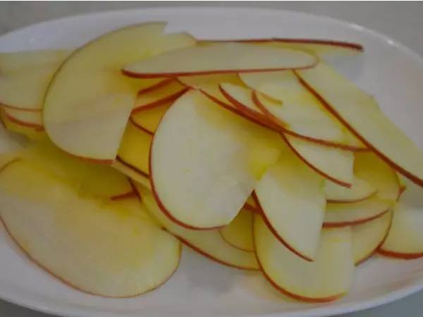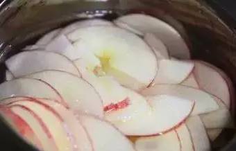 3.用煮好的糖浆水把苹果片烫一下,让苹果片裹上些糖浆,并让苹果片变软一些