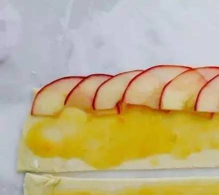 5.在面皮上抹上果酱,在面皮的上部均匀码上苹果片,一般来说,一朵“玫瑰”需要9-10片苹果。