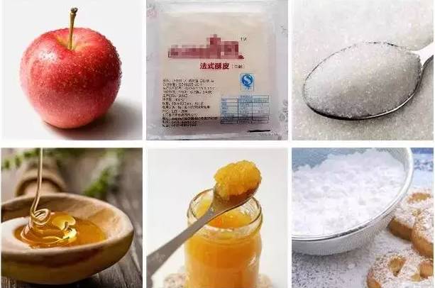 苹果、千层酥皮、白糖、蜂蜜、果酱、糖粉