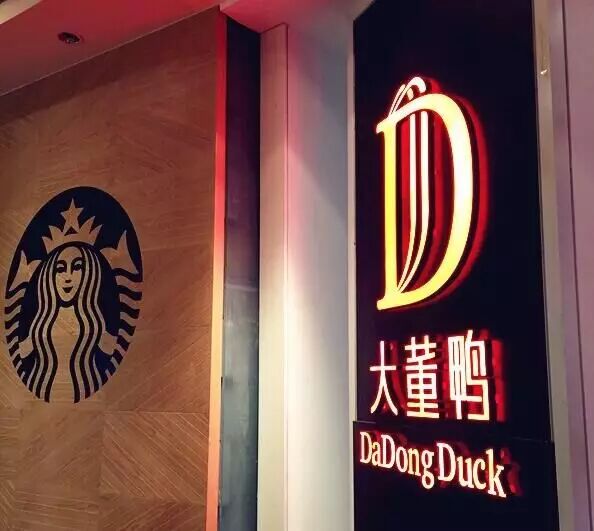 中式快餐“大董鸭”与洋品牌“星巴克”仅一墙之隔。