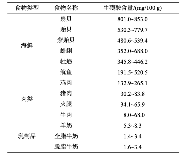 不同食物中牛磺酸的含量[7]