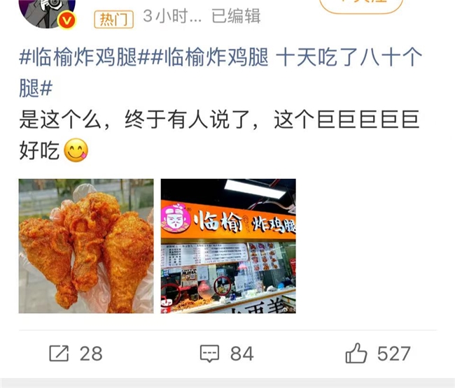1月18日,中式炸鸡品牌临榆炸鸡腿突然在社交媒体平台引发网友热烈讨论,连续三个话题登上微博热搜并引发“临榆炸鸡腿 十天吃了八十个腿”等多个衍生话题,相关阅读量超一亿。谈及喜欢临榆炸鸡腿的原因,网友多数表示被鲜嫩多汁的口感吸引,且口味与韩式、美式炸鸡均有不同,更有网友表示“十天吃了八十个鸡腿”,还有不少网友表示“吃了多年的宝藏品牌终于火了”。