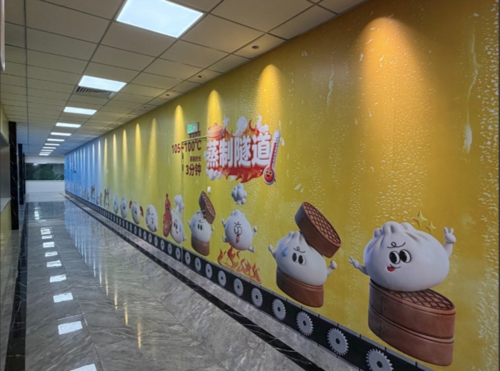 与传统工厂的工业感不同,这里更像一座温暖的“面点童话工厂”。明亮的橙色主调与生动的各类面点Q版形象融于各处,从屋顶瞩目的“会呼吸的包子”雕塑、彰显出海抱负的巨幅海报,到可互动击掌的包子装置、创意面点瀑布,遍布厂区的主题墙绘与趣味灯绘、地绘——每一处设计皆充满故事感与亲和力,让生产空间可触摸、可共鸣。