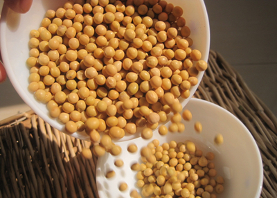 看水分:取一粒生大豆用牙齿咬,发声清脆或碎粒的,说明大豆干燥,质量佳;反之,如果很软,则说明大豆受潮了。